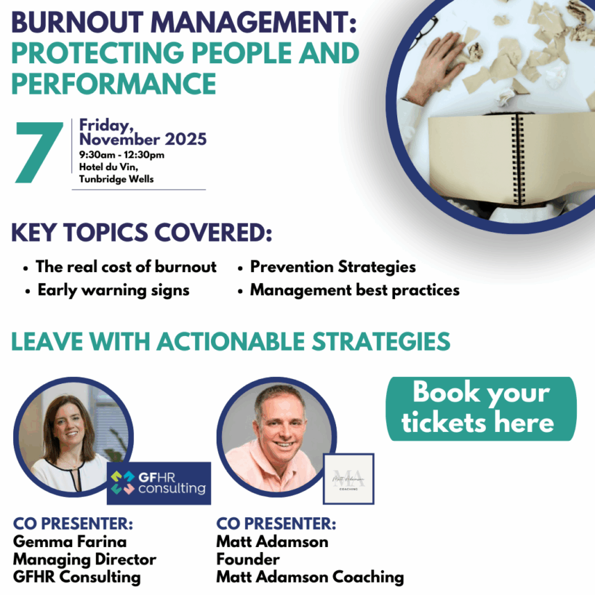Burnout is one of the biggest threats to team performance and wellbeing—and it’s on the rise. Join Gemma and certified burnout coach Matt Adamson at Hotel du Vin, Tunbridge Wells, for a practical and insightful session on how to spot burnout early, prevent it effectively, and manage it with confidence. This workshop is ideal for business owners, managers, and HR professionals looking to protect their people and performance.